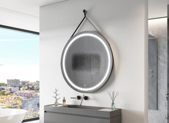 Le miroir rond éclairé est fixé à une bande en cuir, disponible en trois couleurs : noir, marron clair et marron foncé. L'option de personnalisation vous permet d'adapter le miroir à vos goûts et au style de votre intérieur. Une bande élégante en cuir.
